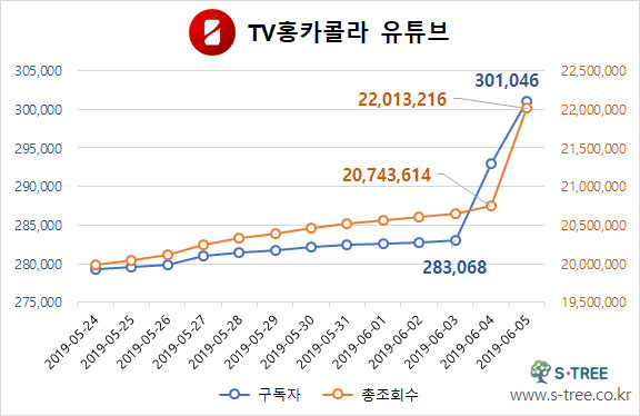 홍준표의 TV홍카콜라는 10일 평균 1일 약 290명의 구독자가 증가하다가 5월 27일 1천명이 늘었고, 방송 당일부터 오늘 12시 자정까지 17,978명의 구독자가 증가했다. 구독자 30만명 넘기기 쉽지 않아 보였는데 이번 한번의 이벤트로 단숨에 30만명을 넘어섰다.