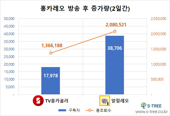 방송 전 10일 평균 대비 방송 후 증가량을 비교해보면 TV홍카콜라는 구독자가 30.3배 증가한 수치이고, 조회수는 21.6배에 해당한다. 알릴레오는 구독자 49.6배, 조회수 27.1배이다.