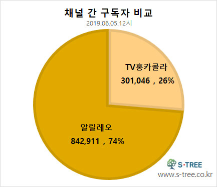 현재 두 채널의 규모를 비교해보면 구독자는 알릴레오 74% : 홍카콜라 26%, 총조회수는 알릴레오 59% : 홍카콜라 41%로 알릴레오가 상당히 앞서있는 편이다.