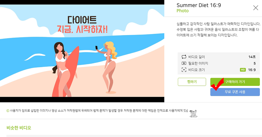 처음 가입한 후 비디오템플릿을 선택하면 [무료 쿠폰 사용] 메뉴를 확인할 수 있다. 제공되는 무료 쿠폰은 8,900원에 해당하는 쿠폰으로 총 2회까지 영상을 제작할 수 있다.
