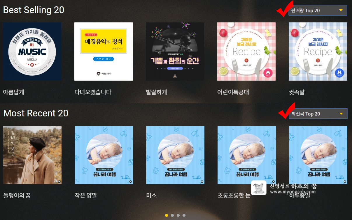 어떤 것도 잘 모를때는 [판매량], [최신곡] 순서로 정렬해서 목록을 보면 인기 높은 영상 음악을 쉽게 찾을 수 있다.