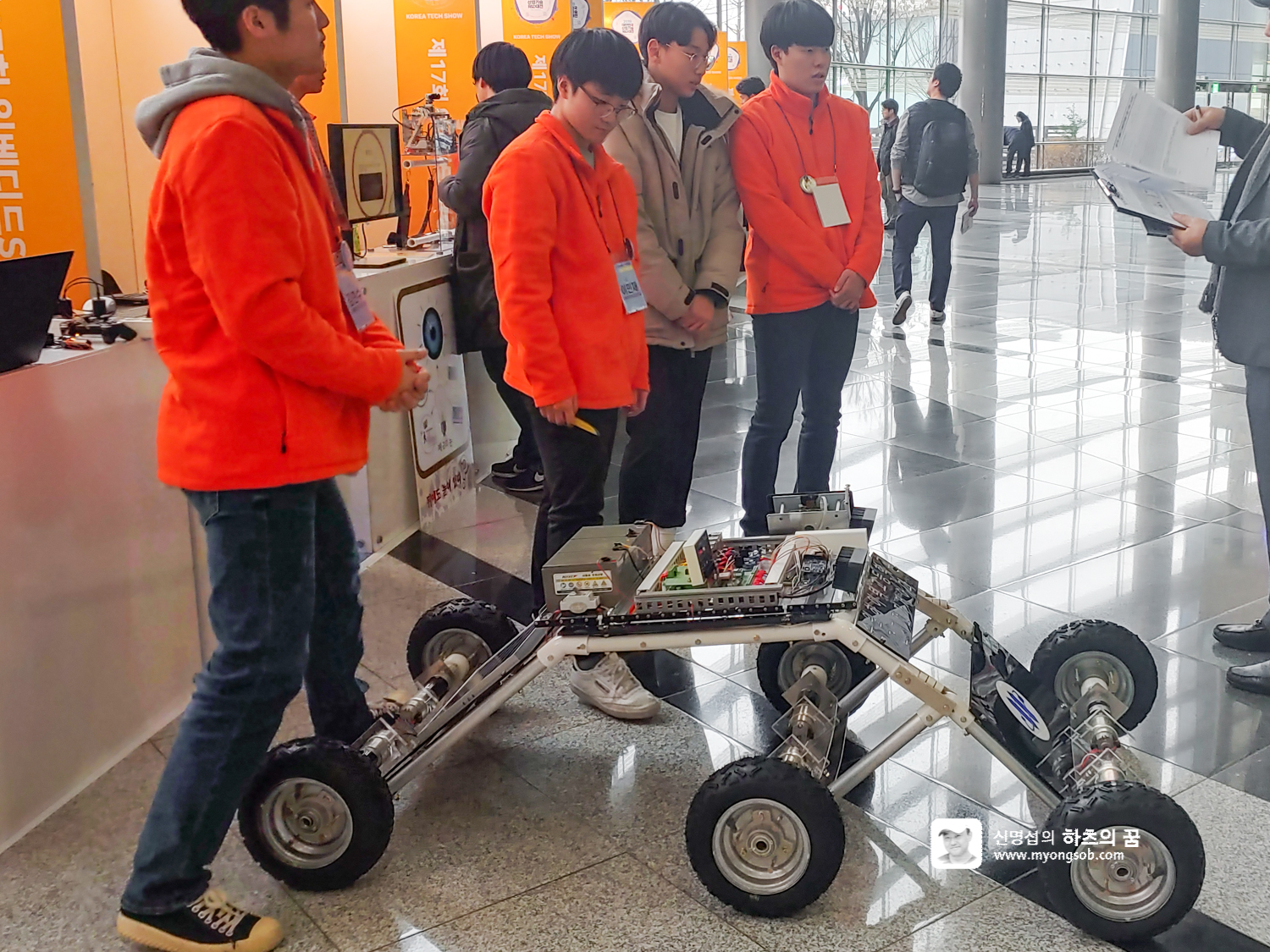 이번 전시회에는 무인 기기에 대한 전시가 많았다. 그 중 패턴 만 인식되면 어렵지 않게 실현이 가능한 것이 택배일 것이다. 신풍초등학교에서는 '무인 택배 계단 로봇'을 선보였다.