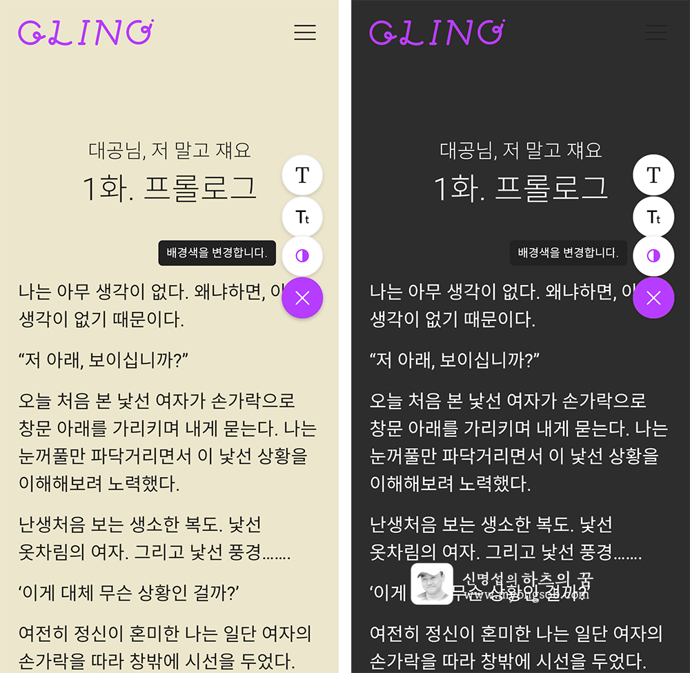 '글링'은 소설 및 웹툰을 볼 때 몇가지 옵션을 제공한다. 우선 배경색을 본인의 스타일에 맞게 설정할 수 있는 기능을 제공한다. 대부분의 스마트폰은 블룰라이트가 발생하기 때문에 오래 보면 눈이 쉽게 피로해진다. 이럴 때는 위와 같이 흐린색으로 배경을 변경하면 좀 더 편안하게 작품을 즐길 수 있다.