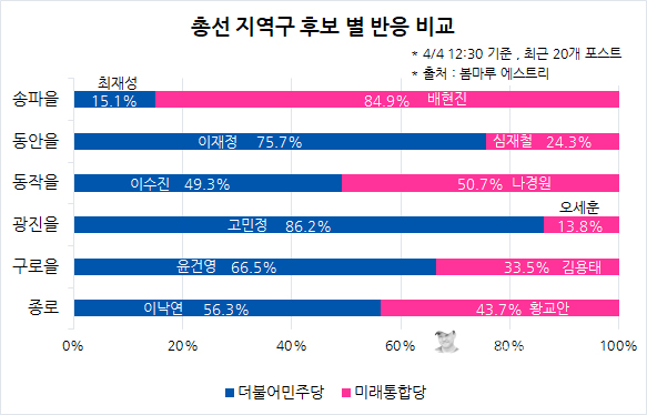 선거 지경별 후보 대결 구도로 보자. 종로 이낙연 56.3% : 43.7%, 구로을 윤건영 66.5% : 김용태 33.5%, 광진을 고민정 86.2% : 오세훈 13.8%, 동작을 이수진 49.3% : 나경원 50.7%, 안양 동안을 이재정 75.7% : 심재철 24.3%, 송파을 최재성 15.1% : 배현진 84.9% 로 나타났다.