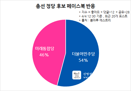 각 후보의 페이스북 반응을 정당 별로 합산해서 보면, 더불어민주당은 좋아요와 공유가 많고, 댓글은 미래통합당이 더 많다. 지수 종합으로 보면 더불어민주당 54%,, 미래통합당 46%로 더불어민주당이 다소 앞서는 것으로 나타난다.