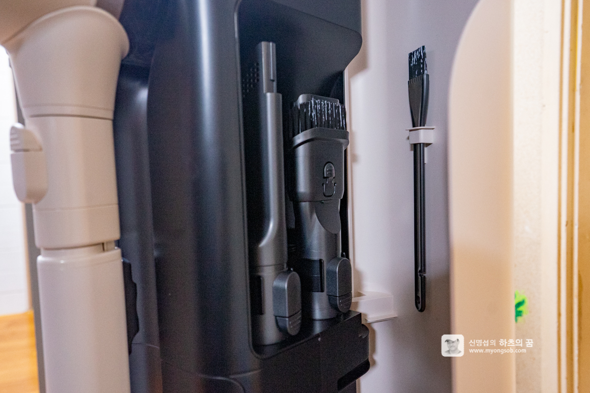 올인원타워의 좌우측면의 커버를 열면 함께 제공도되는 청소 헤드와 툴 등을 보관할 수 있다. 기존 청소기는 이런 부품들을 다른 공간에 보관해야 했는데 아주 깔끔하게 정리할 수 있게 도와준다.