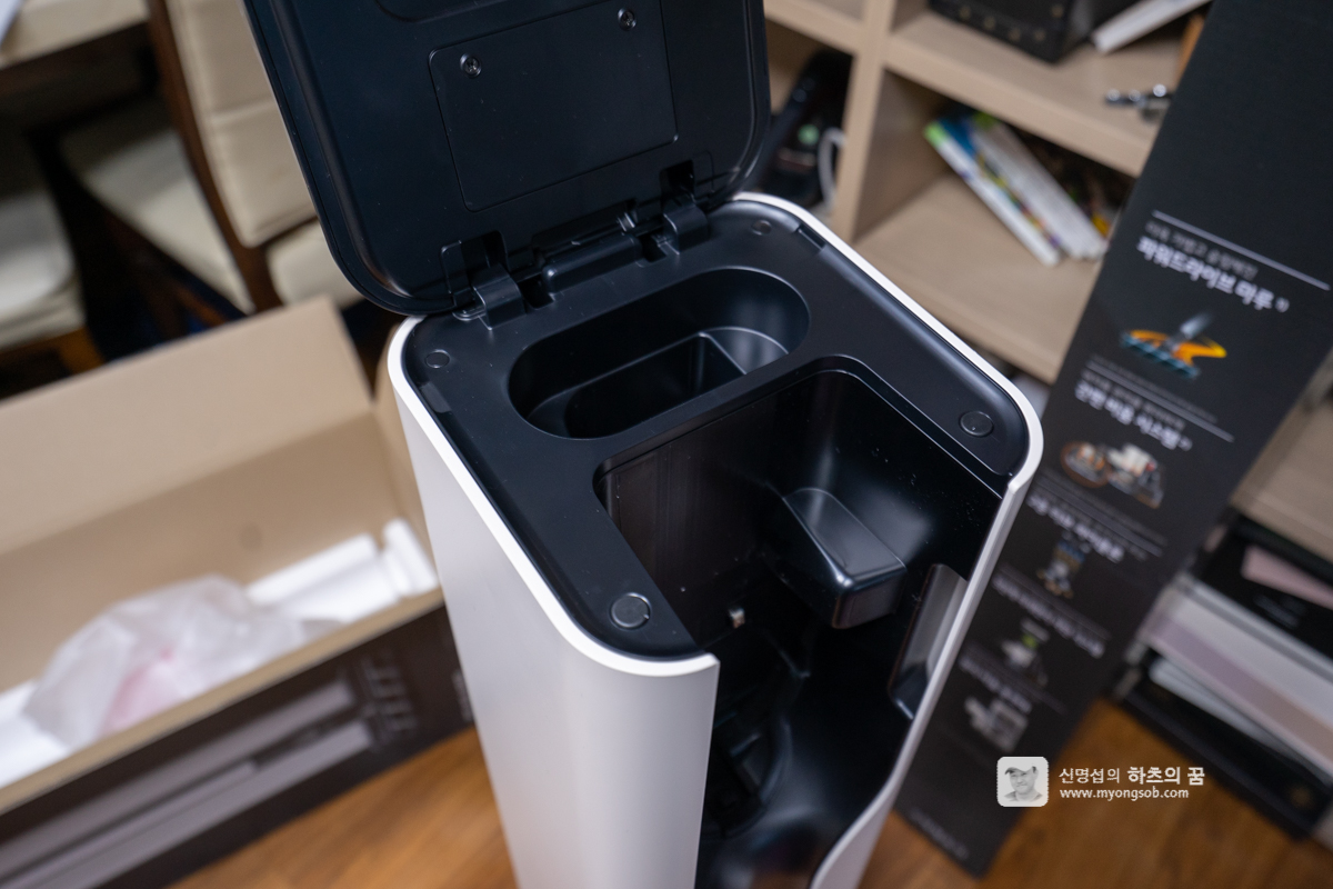 올인원타워의 커버를 열면 먼지봉투와 필터 등을 교체할 수 있는 노란색 오픈 손잡이가 있다. 이걸 열면 위와 같이 먼지봉투와 필터를 꺼낼 수 있다. 먼지봉투는 2.5L의 커다란 크기여서 오랫동안 사용할 수 있고, 1회용이어서 꺼낸 채로 바로 휴지통에 버리면 되기 때문에 먼지청소를 할 때 발생하는 먼지가 전혀 없다.