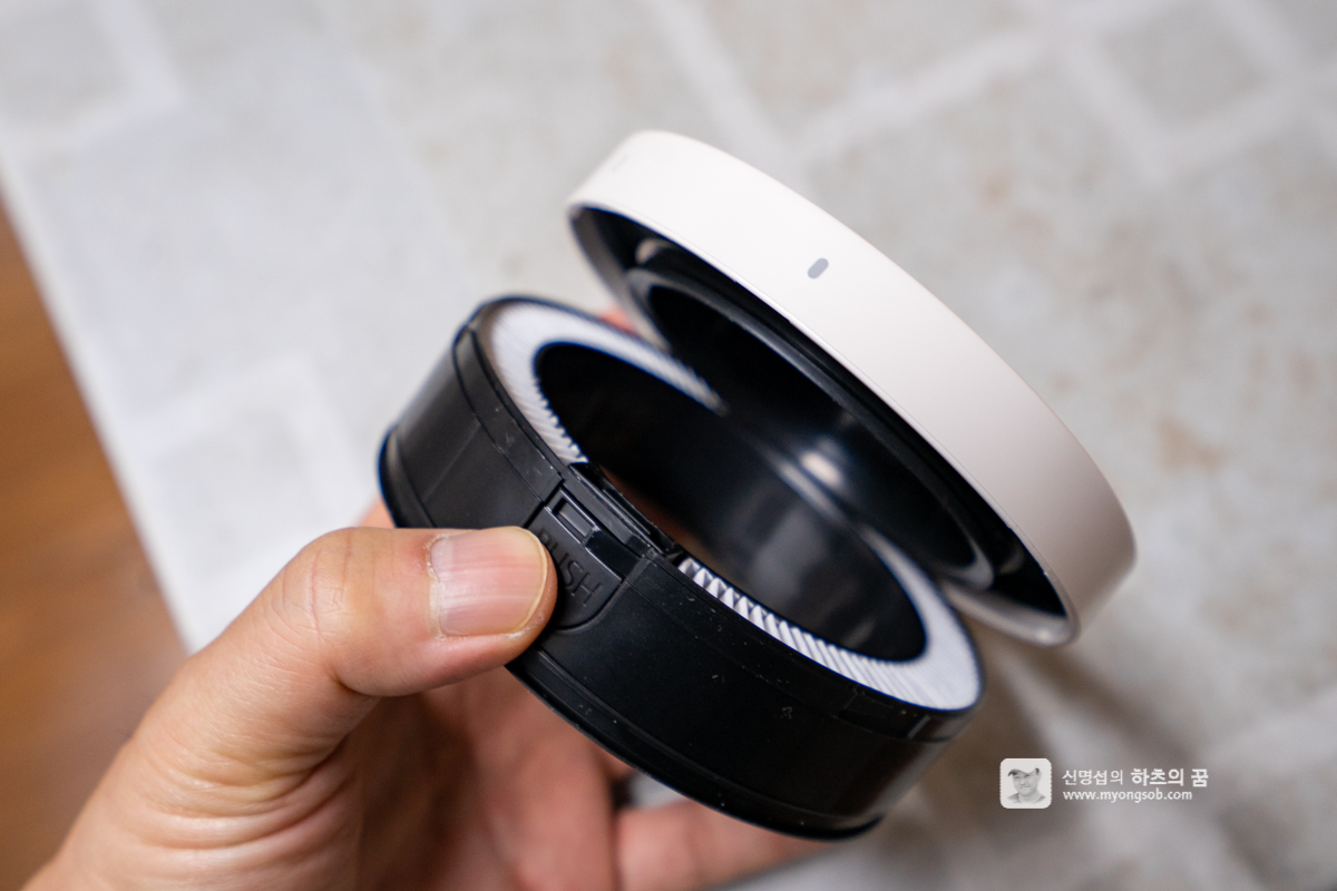 청소기 본체의 상단에는 2개의 필터가 존재한다. 상단부를 살짝 돌리면 위와 같이 분리되고 노란색 필터가 나타난다. 그리고 분리한 상단부의 PUSH 버튼을 누르고 다시 윗 부분을 돌리면 또 다시 필터가 나타난다. 각 필터는 역시 물청소가 가능하다.