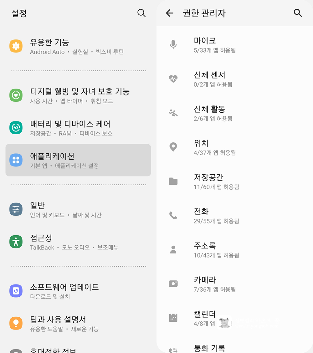 설정->애플리케이션 화면 우측 상단의 메뉴를 터치하면 '권한 관리자'에 접속이 된다. 각 권한에 들어가면 해당 기능에 권한을 가진 앱 목록을 확인할 수 있고, 여기서 해당 기능을 취소할 수 있다. 추후 특정 앱 이용 시 권한이 필요한게 있다면 다시 요구하게 된다.