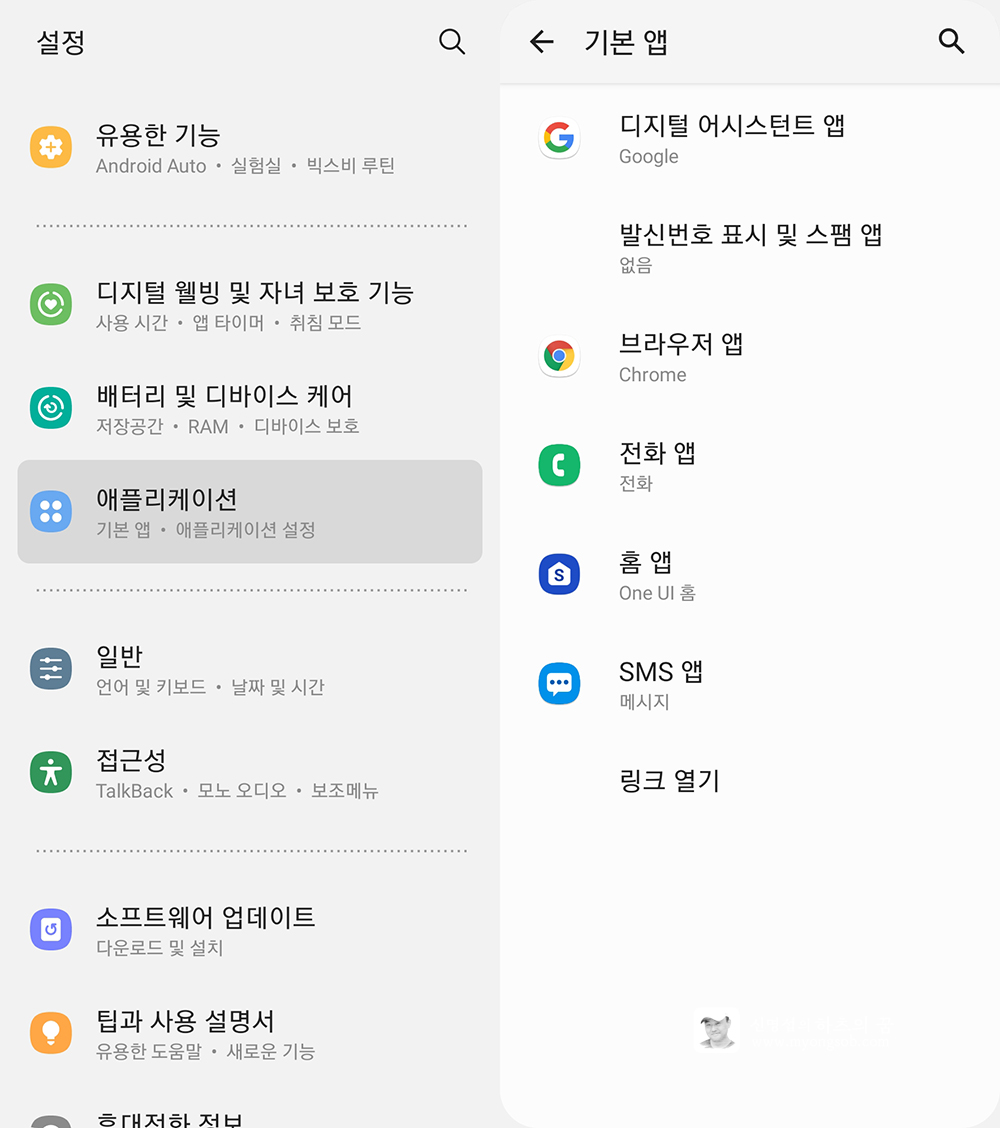 '기본 앱'이란 스마트폰의 기능에 연결되어 있는 앱을 말한다. 웹브라우저는 '크롬', 전화통화는 '기본 전화', 홈 화면은 삼성의 'One UI 홈', 문자메시지는 '메시지' 앱을 기본으로 설정하였다. 초기에는 웹브라우저가 삼성 웹브라우저로 설정되어 있어서 변경했다.