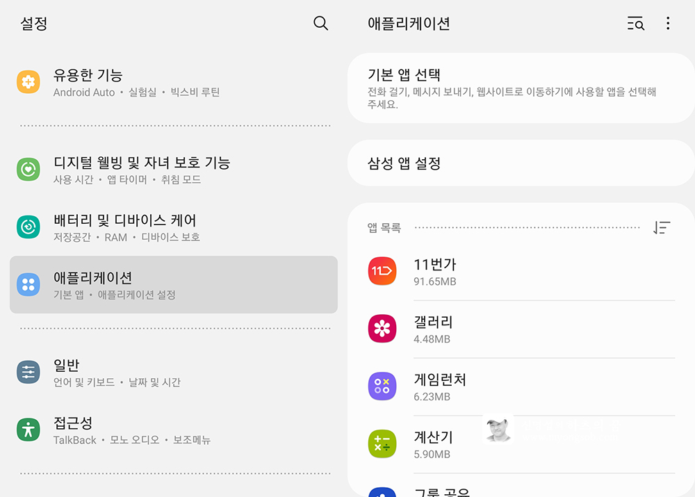 설정->애플리케이션 화면에 들어가면 설치되어 있는 앱을 확인하고 관리할 수 있다. 각 앱이 어떤 권한을 부여받고 있는지, 스마트폰의 가본 기능에 연결되어 있는 기본 앱은 무엇인지 등을 확인할 수 있다.