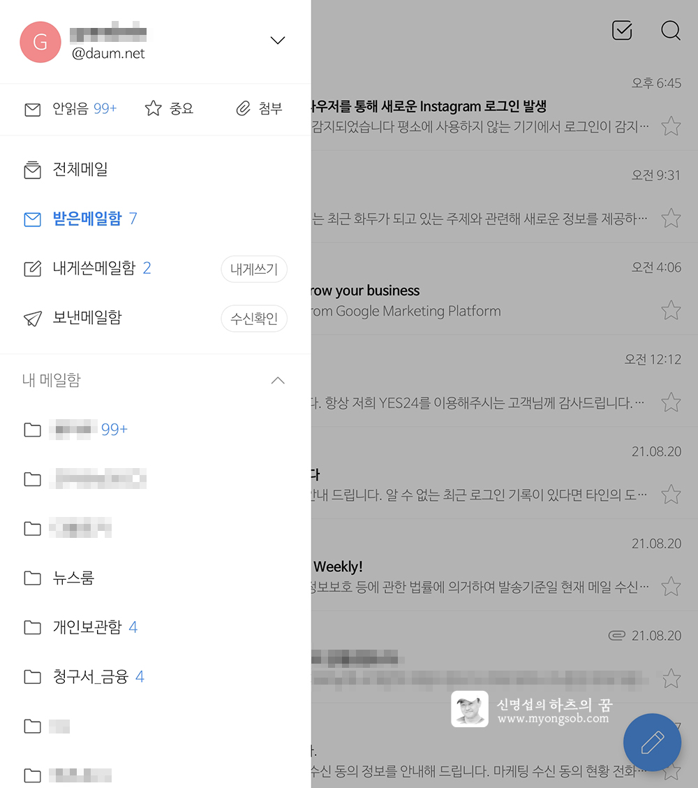 국내에서 가장 많이 사용하는 이메일 앱 중 하나인 다음메일 앱은 넓은 화면을 제대로 사용하지 못한다. 화면이 일반 태블릿 정도의 넓이를 제공하기 때문에 좌측의 분류를 기본적으로 보여줘도 무방할 것 같은데, 그렇지 않고 이메일 목록 만 보여준다.