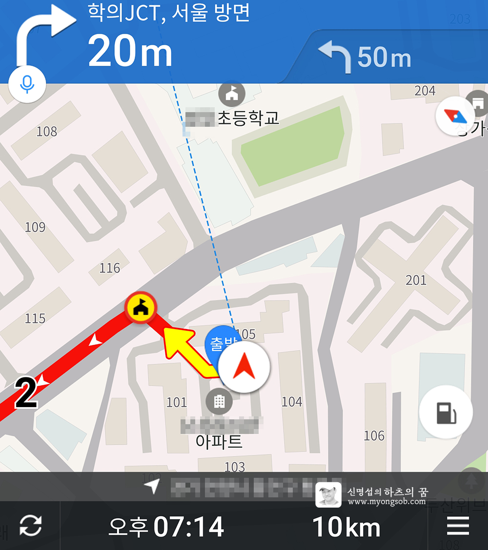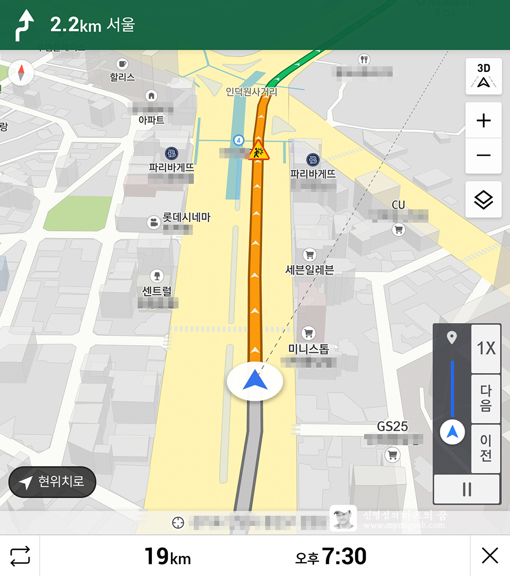 카카오내비는 국내 내비게이션 중 가장 많이 사용하는 앱 중 하나다. 카카오맵은 시원하게 보여서 좋았는데, 연결해서 카카오내비를 켜니 위와 같이 너무 크게 지도를 보여주어 운전할 때 그리 도움이 될 것 같지 않다.
