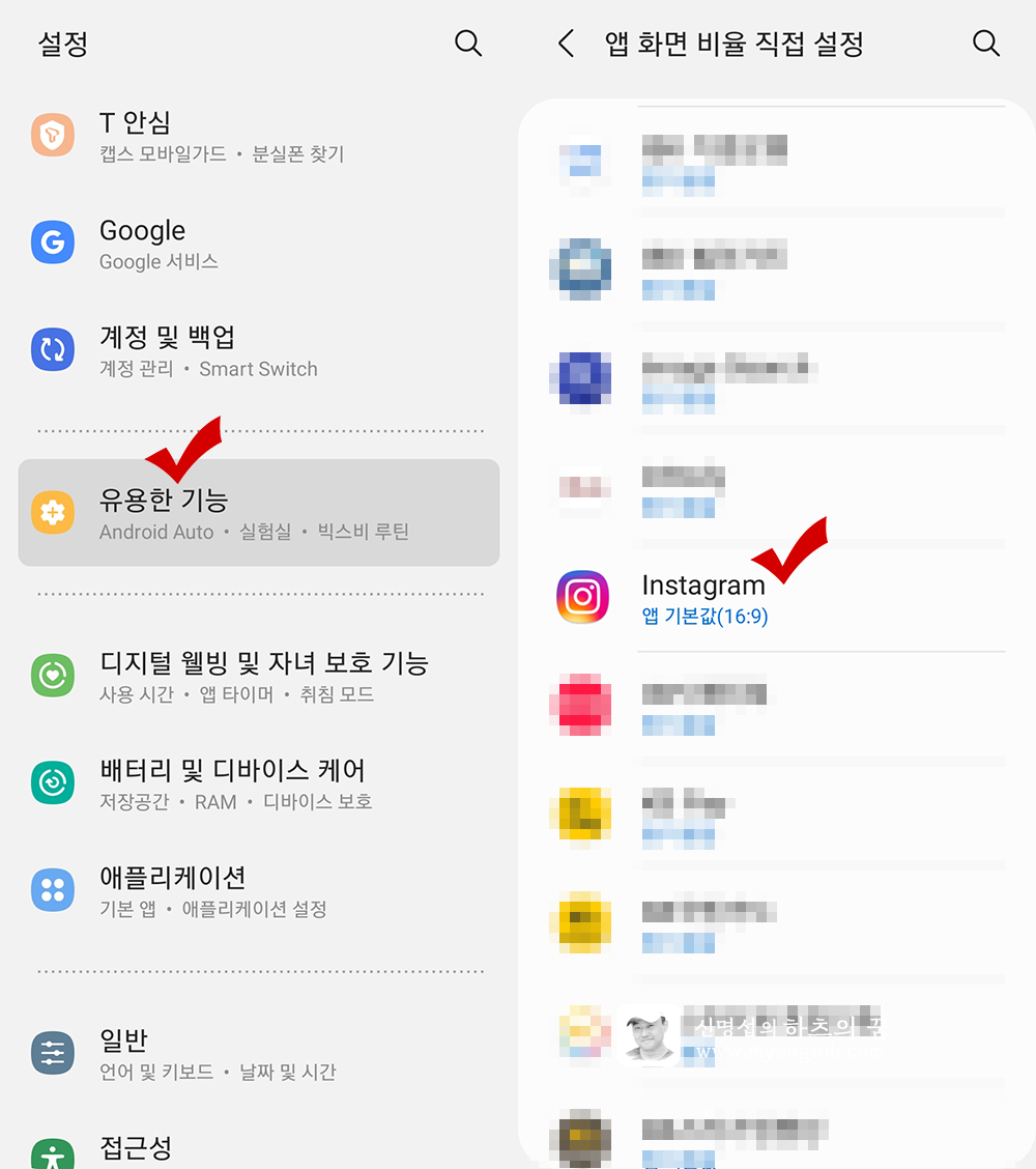 해당 기능은 설정 -> 유용한기능 - 앱 화면 비율 직접 설정 에 접속하면 이용할 수 있다. 해당 화면에 들어가면 사용 중인 앱이 주르륵 나타난다. 여기서 '인스타그램' 등 원하는 앱을 확인한다.