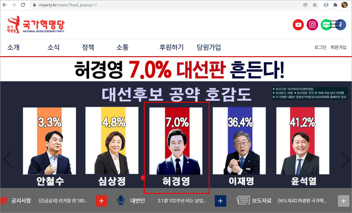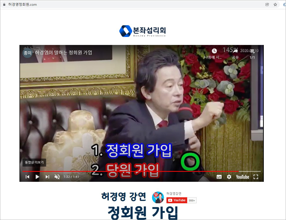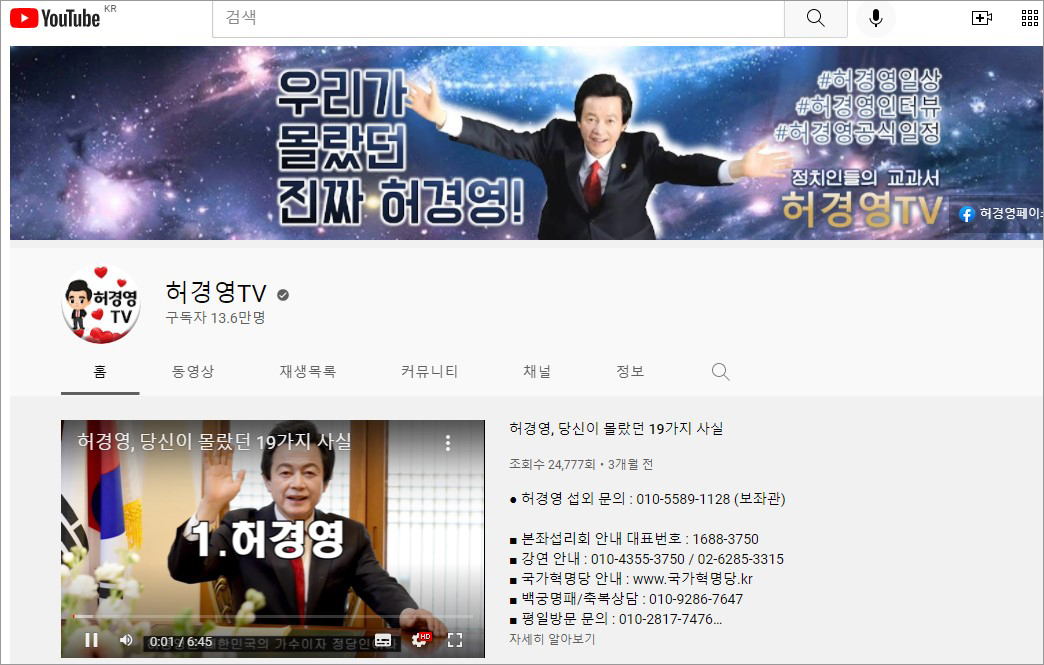 채널 설명 및 아래의 영상 설명에는 대통령 후보로 나가기 위한 정당인 국가혁명당 홈페이지, 본좌섭리회, 허경영정회원 등 다수 홈페이지가 존재한다. 그 중 '국가혁명당' 홈페이지에 들어가 보았다. 첫 화면에 크게 보이는 내용은 '대선후보 공약 호감도' 리서치 결과다. 우측 상단에 조사기관 등을 소개하면서 해당 내용이 신뢰할 수 있다는 것을 말하고 있다.