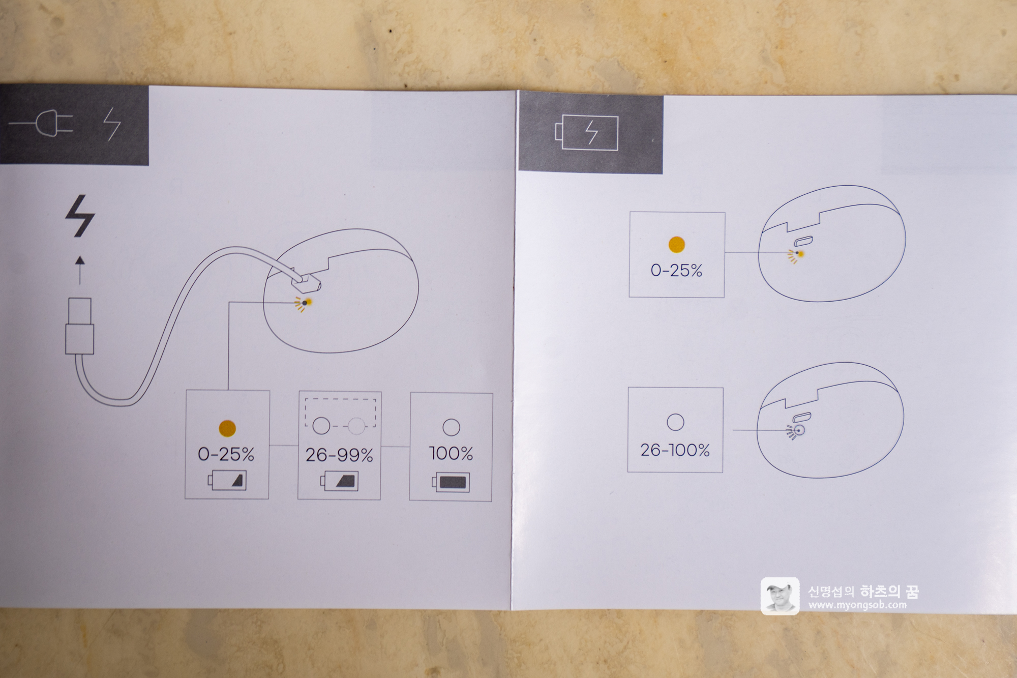 이번 제품의 충전 케이스 뒷면에는 버튼이 하나 존재한다. 충전중일 때 해당 버튼을 누르면 위와 같이 3단계로 케이스 충전 현황을 파악할 수 있다. 충전중이 아닐때는 2단계로 충전 현황을 파악할 수 있다.