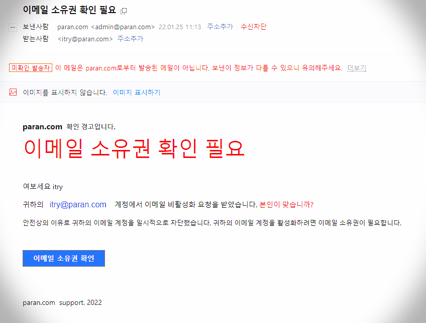 필자가 사용하는 이메일 도메인은 'paran.com'으로, 이미 오래전 서비스가 폐쇄되었고 이메일 서비스 만 다음메일로 이관되어 사용하고 있다. 그러니 이러한 메일이 온다면 당연히 '다음메일'로 발신자가 표시되어야 하는데, 'admin@paran.com'으로 왔다는 것이 우선 의심할 수 있는 부분이기는 하다.