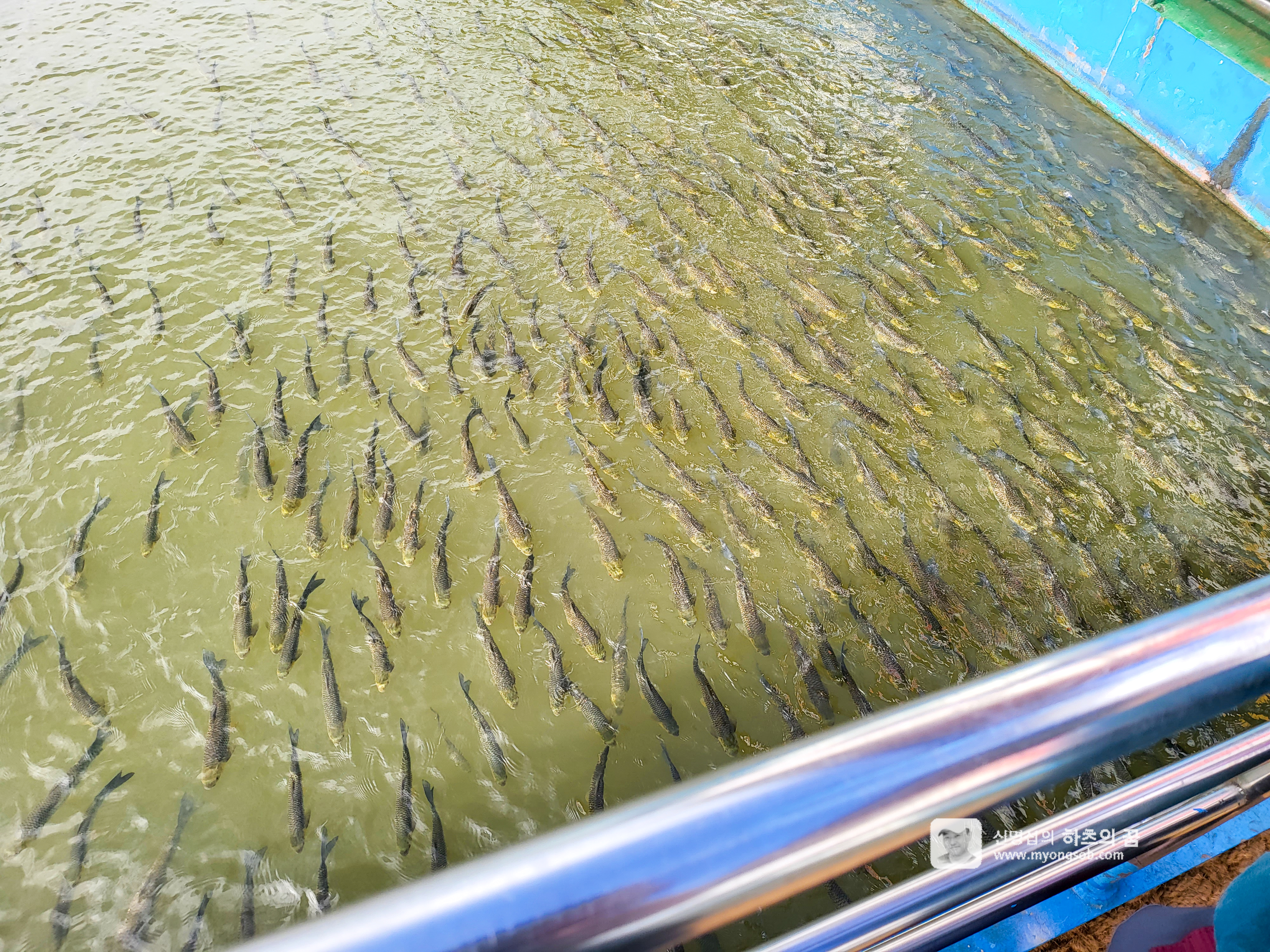 구드레 선착장에 도착했을 때 엄청난 떼의 물고기에 깜짝 놀랐다. '눈불개 눈치'라는 어종으로 표기가 되어 있고, 강냉이나 뻥튀기를 주면 사정없이 덤비며 철퍽거린다. 줄지어 수영할때는 괜찮았는데 음식을 주니 공포영화의 한장면으로 변하는 듯 색달랐다.