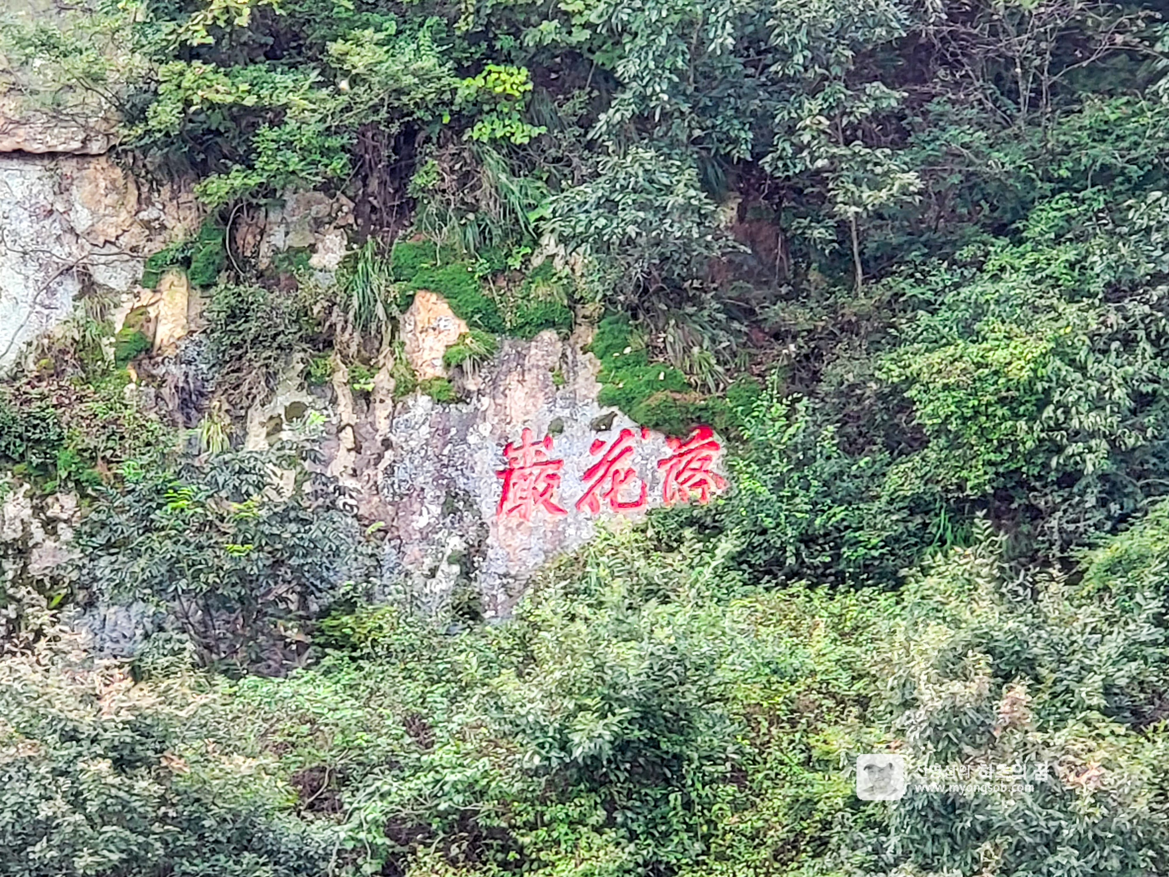 10여분 이동을 하니 저멀리 산자락에 빨간색 한자로 낙화암(落花岩)이라는 글씨가 보인다. 해당 글자는 조선 후기 문신인 우암 송시열의 글씨로 추정된다고 한다. 붉은 색은 그 이후에 덧칠된 것이다.
