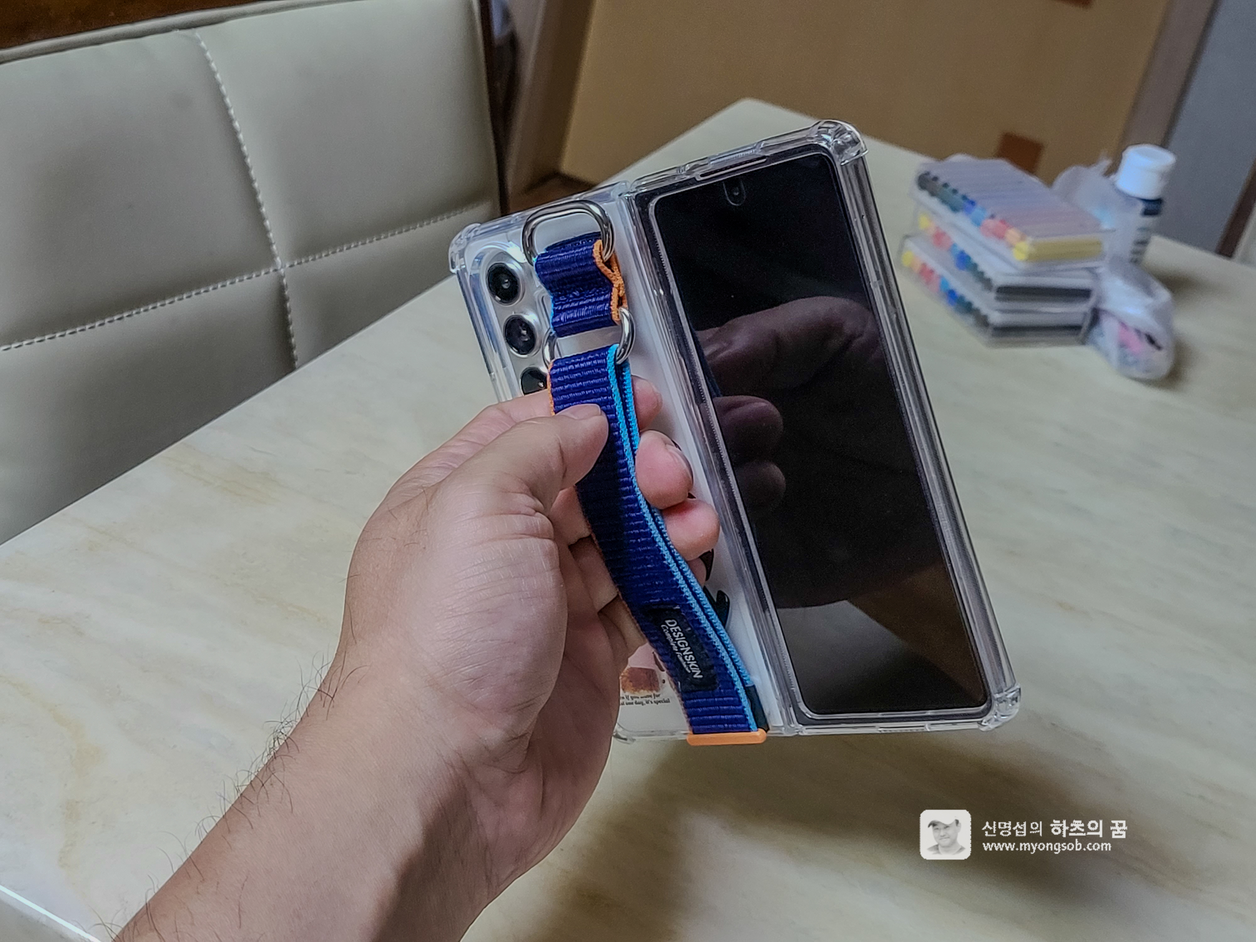 일반적으로 스트랩 케이스는 자주 손을 넣다보니 고정 부분이 흔들리거나 헐거워지는 경우가 많은데, 폴드5 디자인스킨 스포티스크랩 케이스는 단단하면서도 디자인을 해치지 않는 구조로 만들어져 있다.