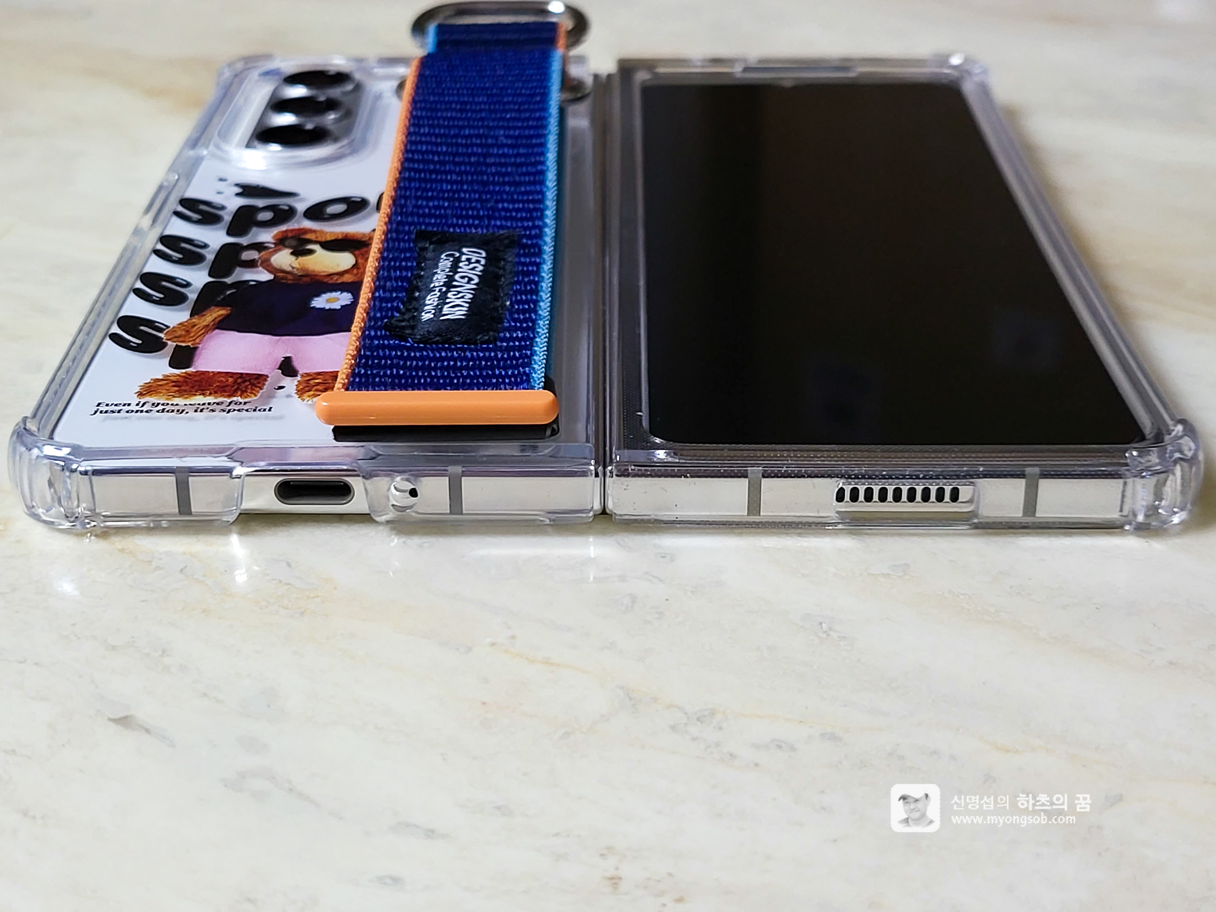 폴드5에 케이스를 부착했을 때 어느 하나 빠짐없이 폰을 잘 감싸주고 있다. 테디베어 인쇄 및 전체적인 디자인은 매우 만족스럽다. 폰의 재질은 너무 딱딱하지 않고 살짝 부드러운 느낌이라 더 좋다.