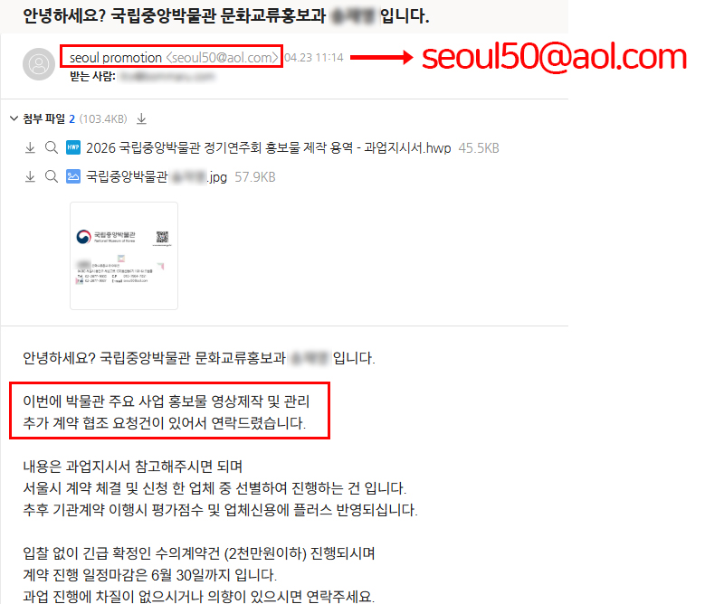 최근 정부 부처를 사칭해 사업 참여 기회를 준다는 이메일이 무차별적으로 발송되고 있다. 필자가 받은 메일은 "국립중앙박물관 문화교류홍보과" 명의로 된 홍보 영상 제작 사업 안내였다. 가뜩이나 일감이 아쉬운 시기에 이런 대형 공공기관의 제안은 혹할 수밖에 없다.